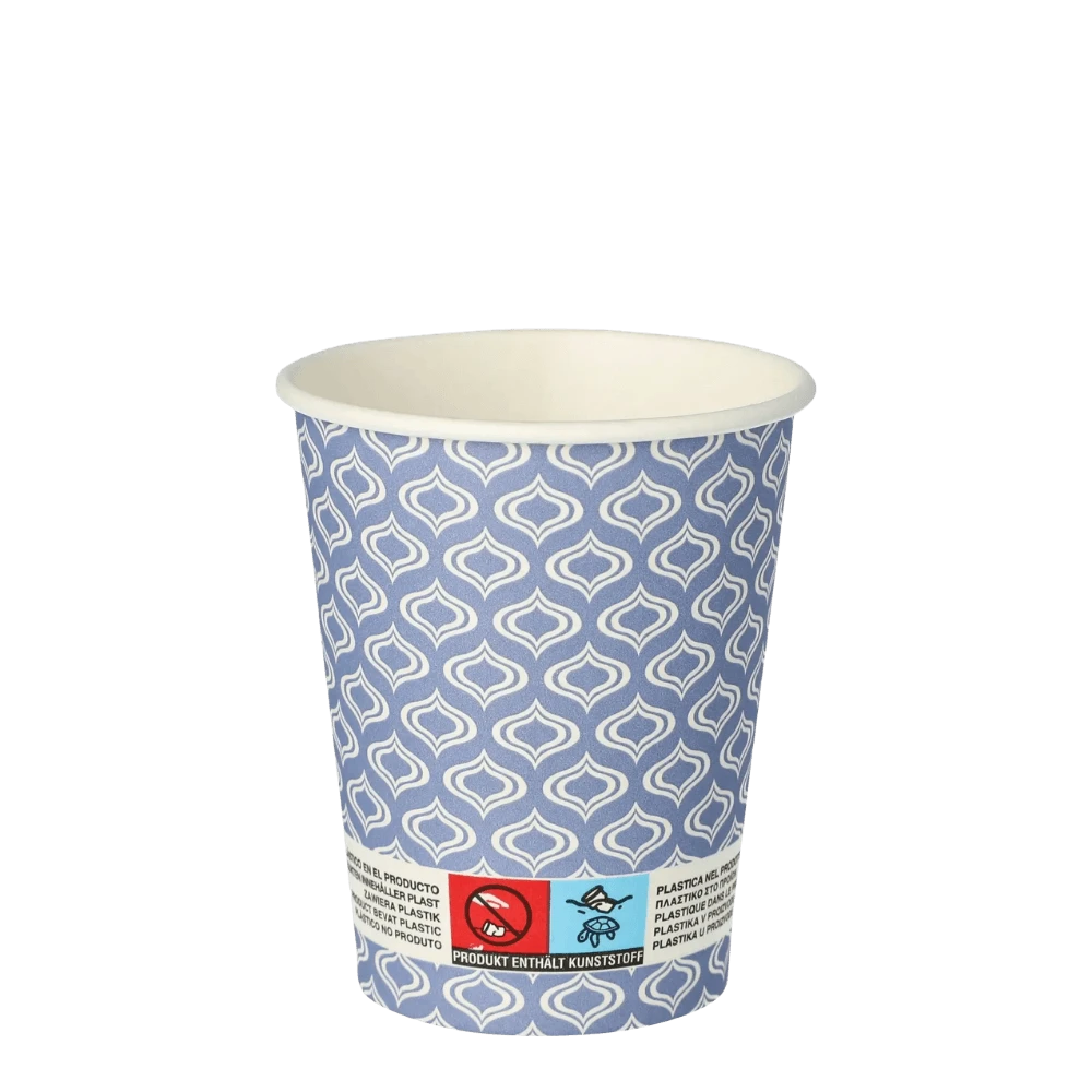 Papierowy kubek z wzorem Blue Drop to gotowe rozwiązanie dla punktów gastronomicznych, które chcą serwować kawę na wynos z charakterem. Niebieska, odświeżająca kolorystyka przyciąga wzrok i wyróżnia się na tle standardowych białych kubków. Wykonany z tektury powlekanej PE o gramaturze 270 g/m² z certyfikatem FSC®, łączy szczelność z odpowiedzialnym podejściem do środowiska. Pojemność 0,2L to kompaktowy format na mniejsze kawy, herbaty czy gorącą czekoladę w trasie.
