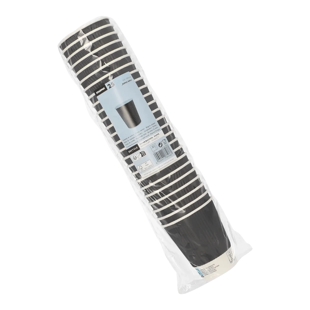 Czarny kubek papierowy z falowaną strukturą Ripple Wall w wersji 0,2L to najbardziej uniwersalny wybór dla kawiarni i jej klientów. Dla tych, którzy potrzebują czegoś pomiędzy espresso a dużą kawą. Wykonany z tektury powlekanej PE o gramaturze 500 g/m², łączy mini rozmiar z pełną niezawodną ochroną termiczną. Falowana struktura eliminuje potrzebę jakiejkolwiek dodatkowej opaski termicznej, a czarna kolorystyka z certyfikatem FSC® podkreśla profesjonalizm lokalu.