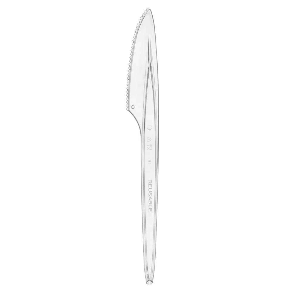 Transparentny nóż z polistyrenu PS o długości 18 cm to rozwiązanie stworzone dla lokali gastronomicznych, firm cateringowych oraz hoteli, które szukają sztućców łączących elegancką prezencję z wysoką funkcjonalnością i trwałością. Przezroczysty materiał nadaje nożowi nowoczesny wygląd, który świetnie komponuje się z każdym rodzajem zastawy, nie dominując wizualnie podawanych potraw. Dzięki odpowiedniemu wyprofilowaniu krawędzi tnącej nóż zapewnia wygodne krojenie w delikatnych daniach, a jego stabilna konstrukcja pozwala korzystać z niego także przy porcjach wymagających nieco większego nacisku. Produkt został przetestowany pod kątem wielokrotnego użytkowania i zachowuje swoje właściwości po ponad 125 cyklach mycia i suszenia, co czyni go praktyczną alternatywą dla jednorazowych sztućców.