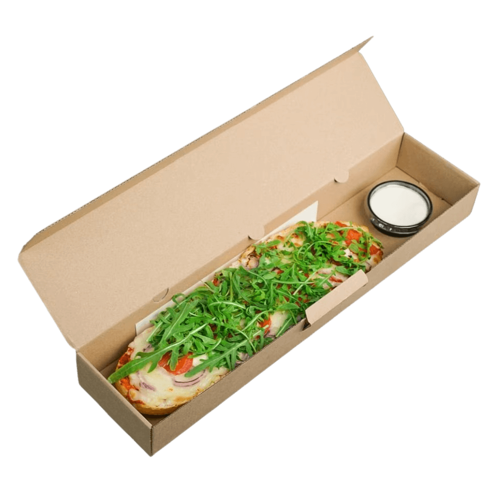 Pudełko na zapiekankę 45 × 10 × 5 cm – 50 szt. – sztywne opakowanie z tektury falistej do zapiekanek, hot-dogów i bagietek